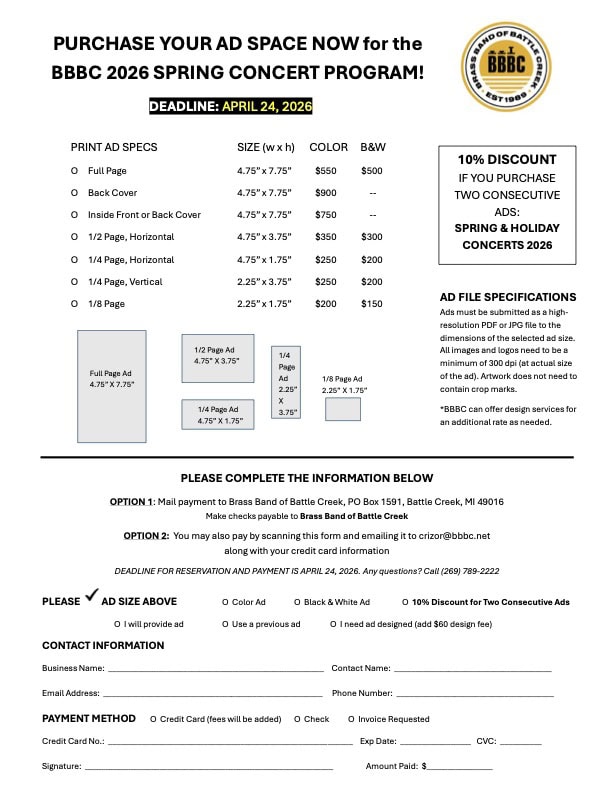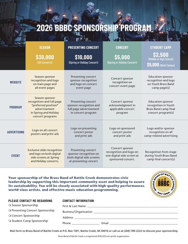 Your sponsorship of the Brass Band of Battle Creek demonstrates civic leadership by supporting this important community asset and helping to assure its sustainability. You will be closely associated with high-quality performances, world-class artists, and effective music education programming.